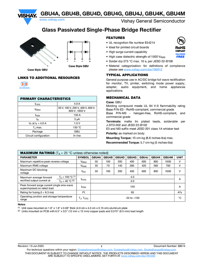 Mostek prostowniczy; GBU4K-E3; 4A; 800V; płaski; przewlekany (THT); typ FM 23x19x3,5mm; VISHAY; RoHS