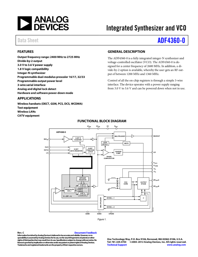 ADF4360-0: Integrated Integer-N Synthesizer/VCO Output Frequency 2400-2725