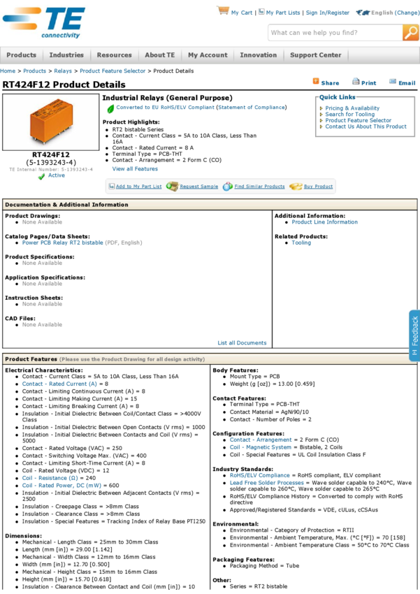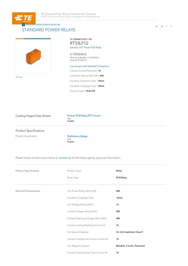 Electromechanical Relay SPDT 16A 12VDC 240Ohm Through Hole