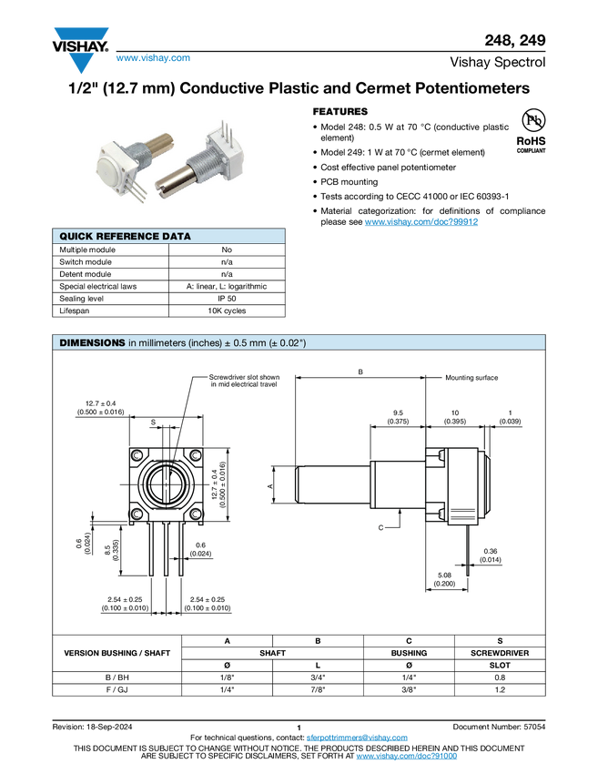1/2" (12.7 mm) Conductive Plastic and Cermet Potentiometers