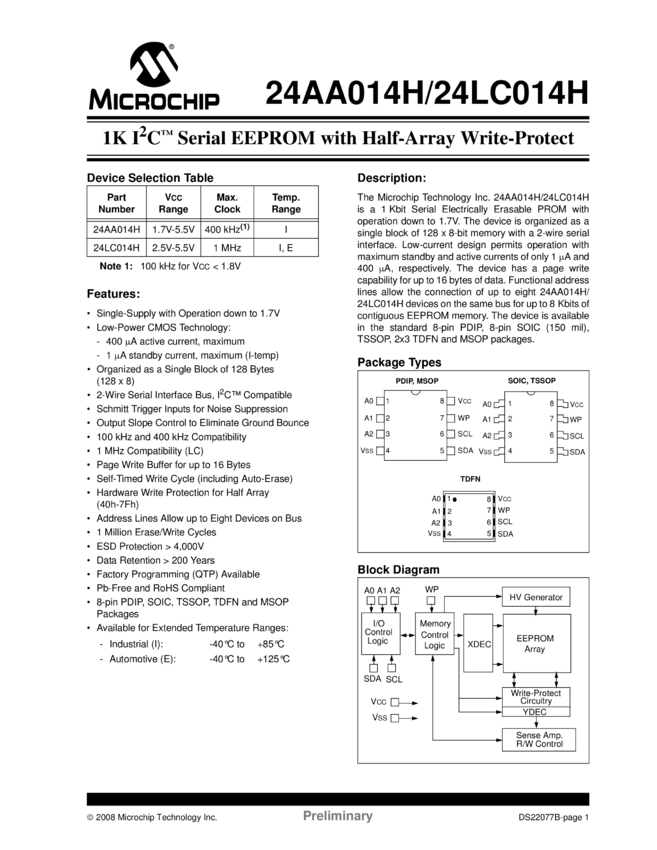 24AA014H/24LC014H 1K I2C? Serial EEPROM with Half-Array Write-Protect (10/03/2008)
