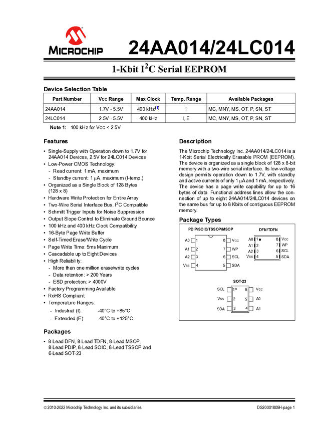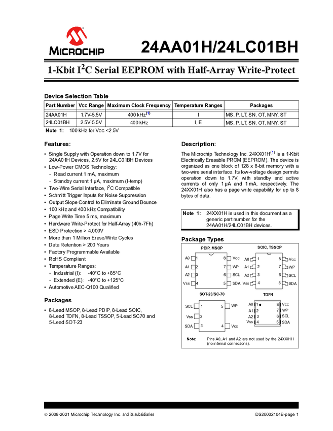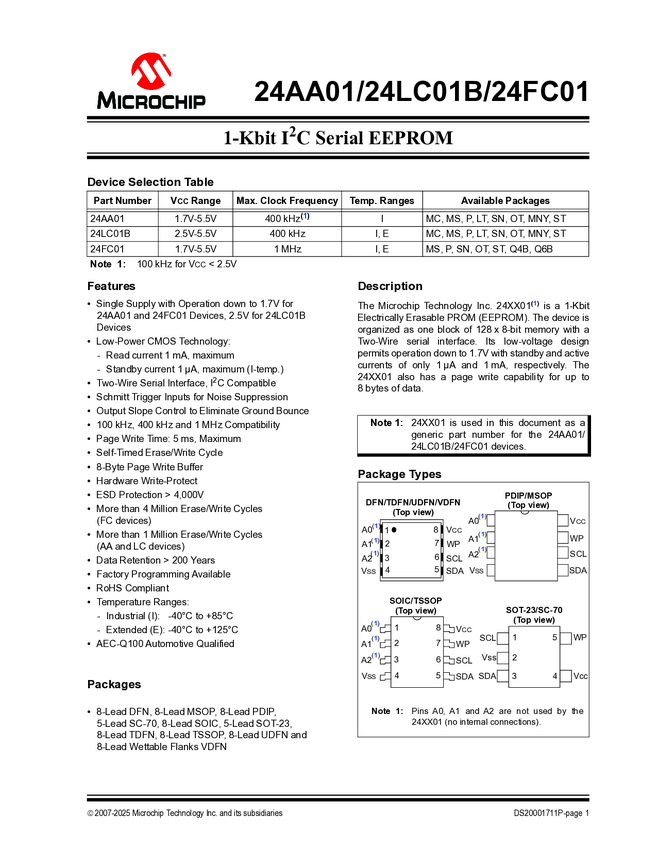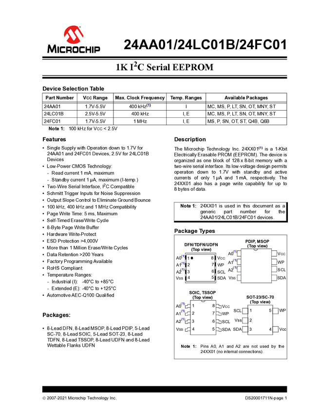 24AA01/24LC01B/24FC01 - 1-Kbit I²C Serial EEPROM