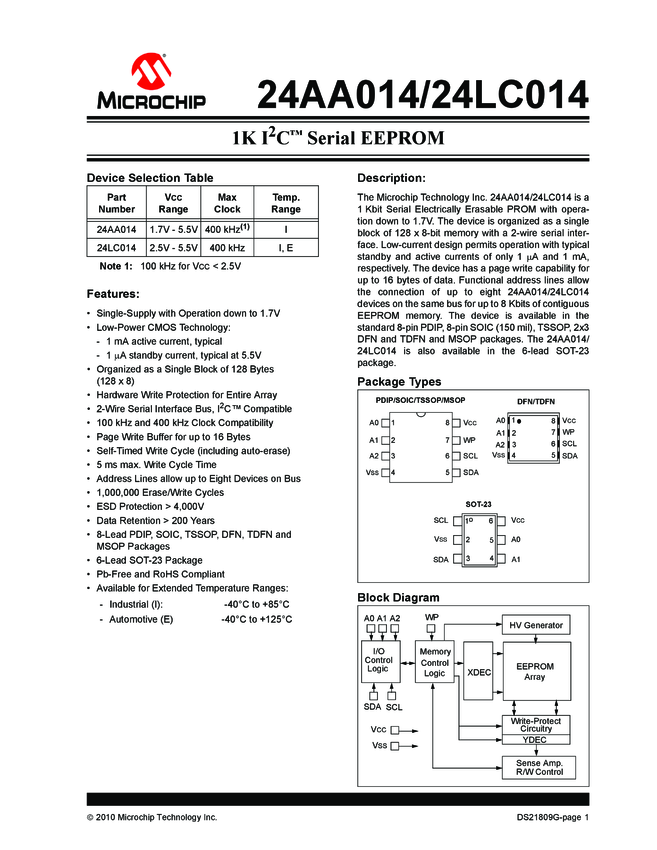 24AA014/24LC014 Device Data Sheet (08/24/2010)