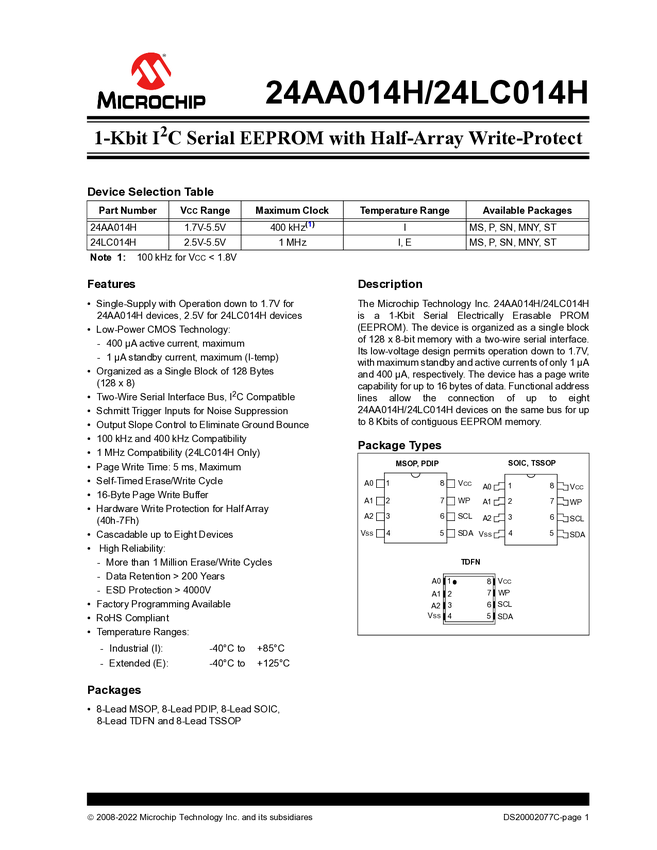 24AA014H/24LC014H 1-Kbit I2C Serial EEPROM with Half-Array Write Protect Data Sheet
