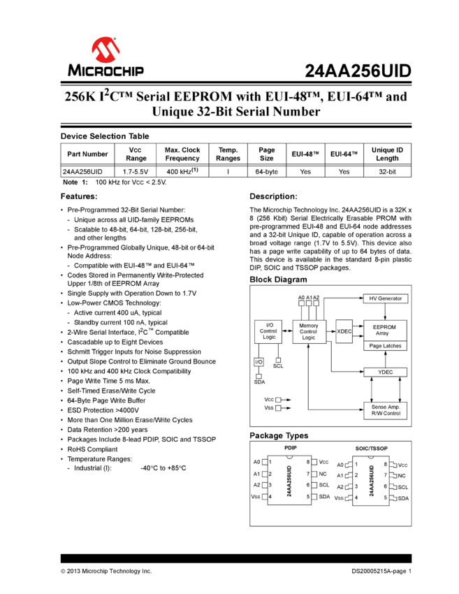24AA256UID 256K I2C Serial EEPROM with EUI-48, EUI-64 and Unique 32-Bit (06/26/2013)