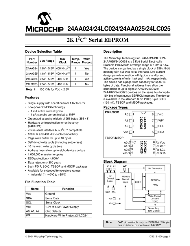 24AA024/24LC024/24AA025/24LC025 2-Kbit I2C Serial EEPROM Data Sheet