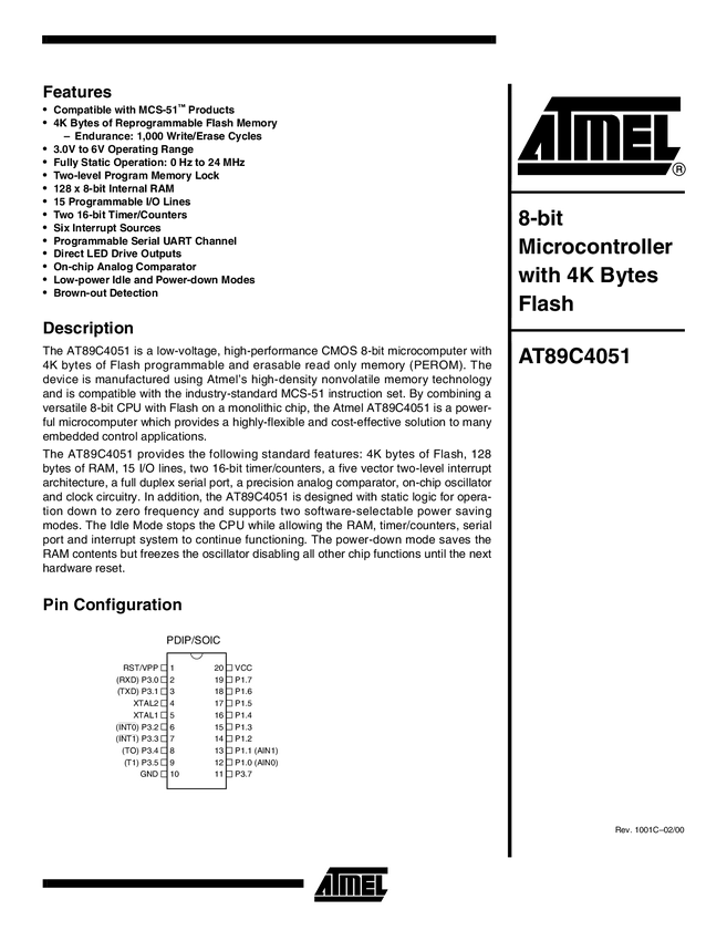 Układ scalony; AT89C4051-24PU; mikrokontroler 8051; Flash:4kx8bit; SRAM:128B; Interfejs: UART; DIP20; THT; MICROCHIP
