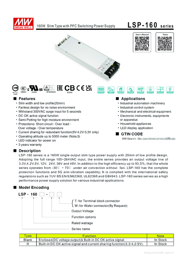Zasilacz przemysłowy MW Mean Well LSP-160-24T 24 V 6.75 A 162 W