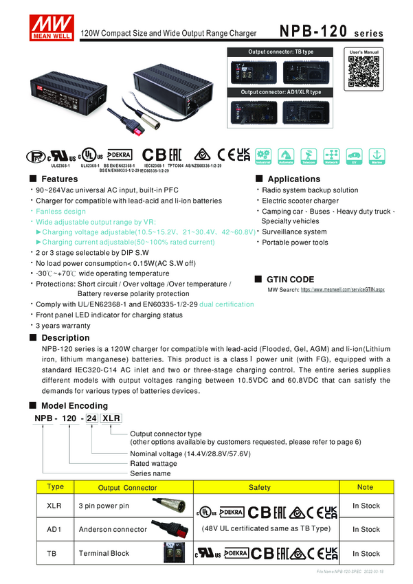 Ładowarka akumulatorów kwasowo-ołowiowych MW Mean Well NPB-120-24TB 24 V 4 A