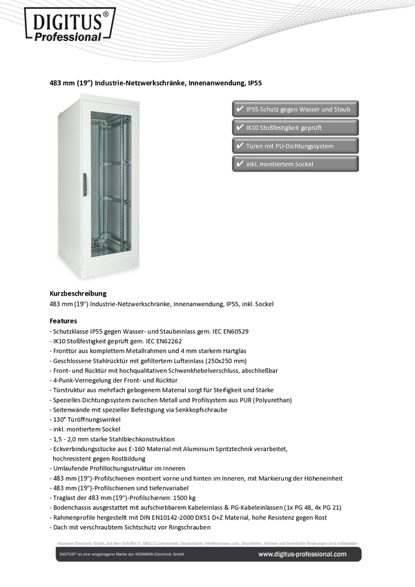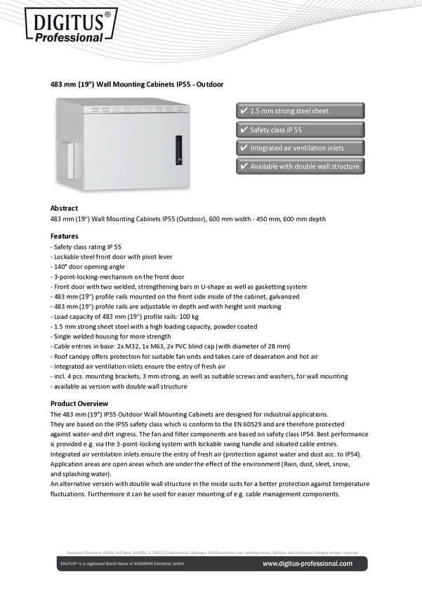 Szafa rack wisząca 19'' Digitus DN-19-24U-I-OD (S x W x G) 600 x 1245 x 450 mm 24 U