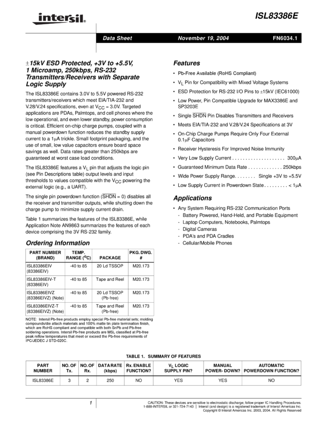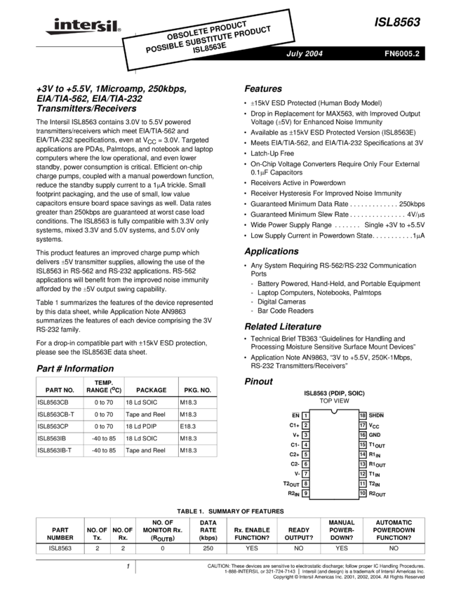 +3V To +5.5V, 1microamp, 250kbps, RS-232 Transmitters/Receivers