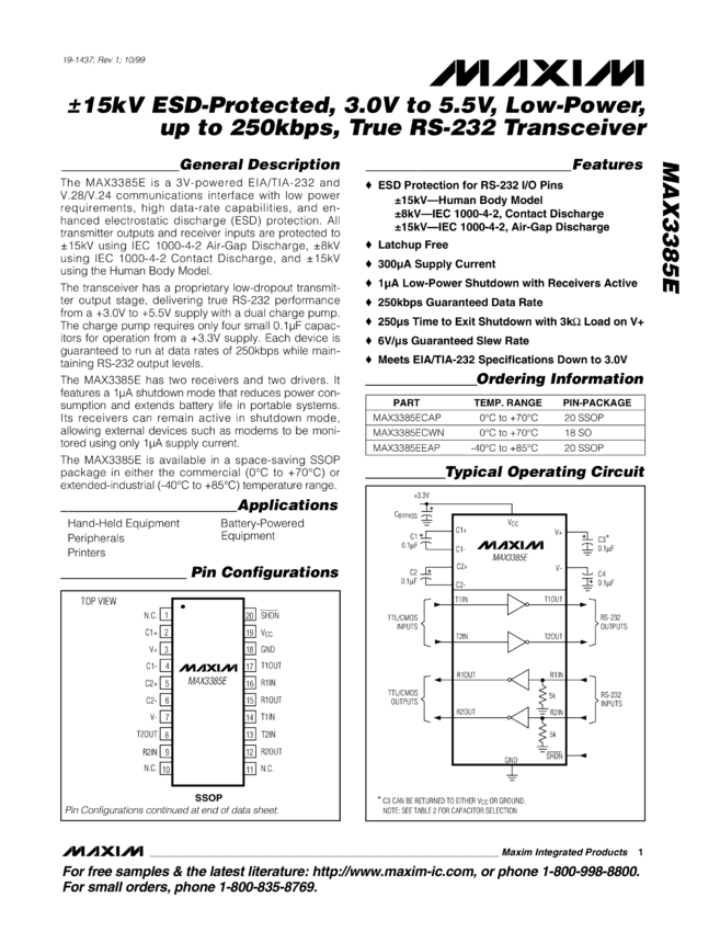 MAX3385E ±15kV ESD-Protected, 3.0 to 5.5V, Low-Power, Up to 250kbps, True RS-232 Transceiver