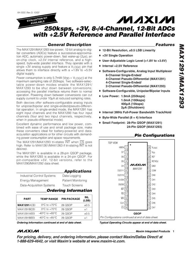 MAX1291, MAX1293 250ksps, +3V, 8-/4-Channel, 12-Bit ADCs with +2.5V Reference and Parallel Interface