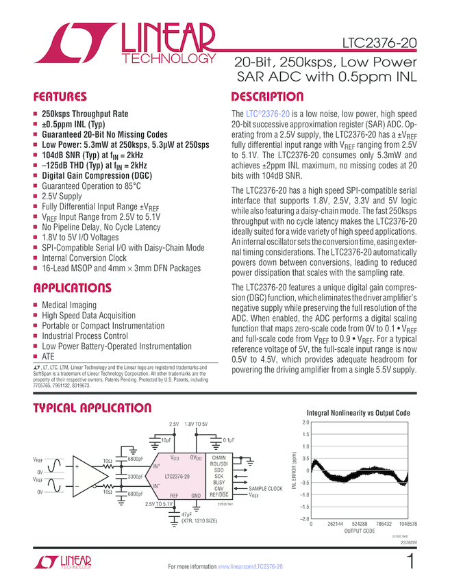 20-Bit, 250ksps, Low Power SAR ADC with 0.5ppm INL
