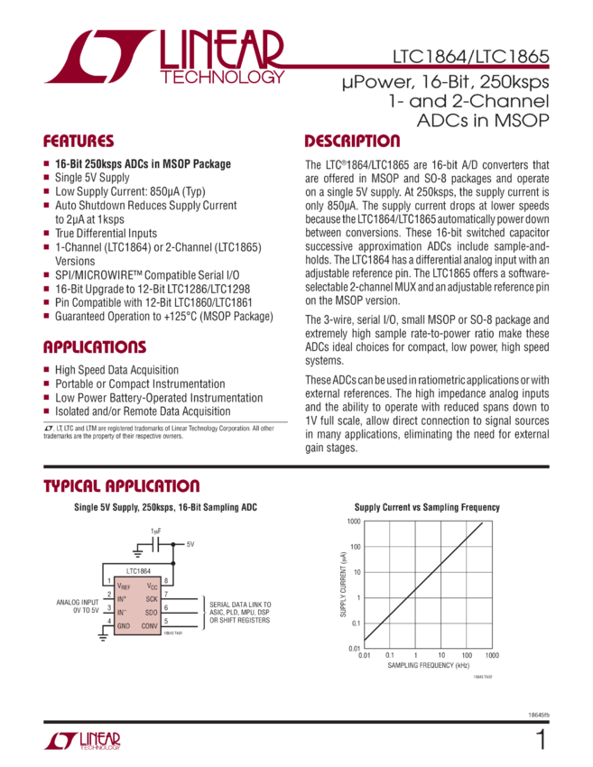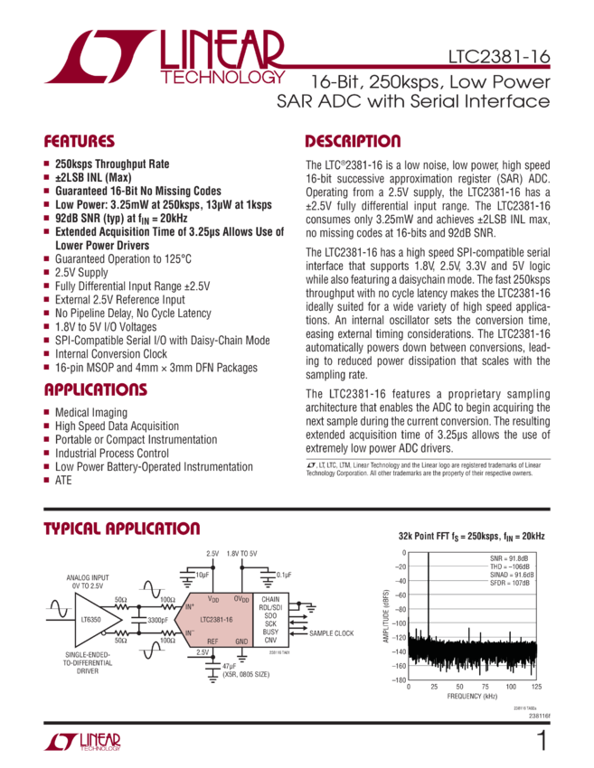 16-Bit, 250ksps, Low Power SAR ADC with Serial Interface