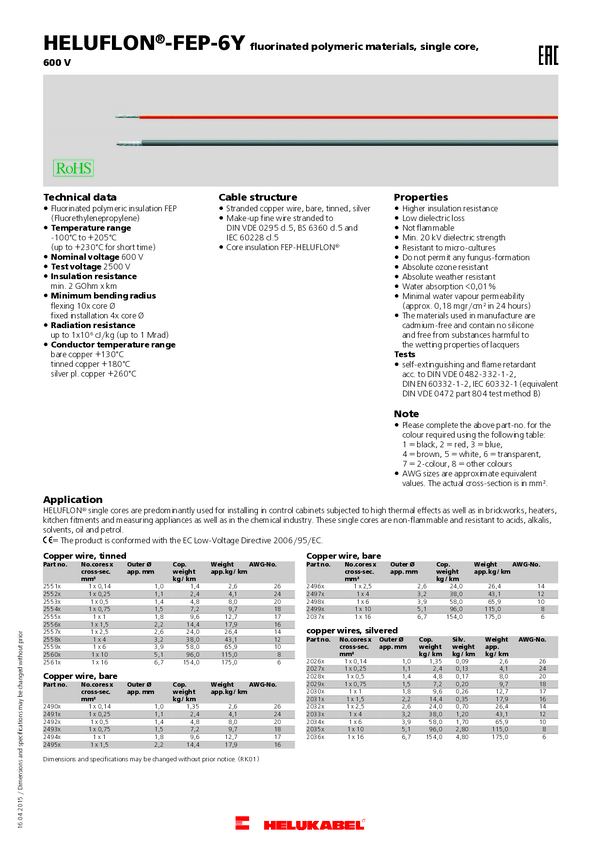Helukabel 25532-500 Kabel odporny na wysokie temperatury HELUFLON®-FEP-6Y, 1 x 0.50 mm², 500 m