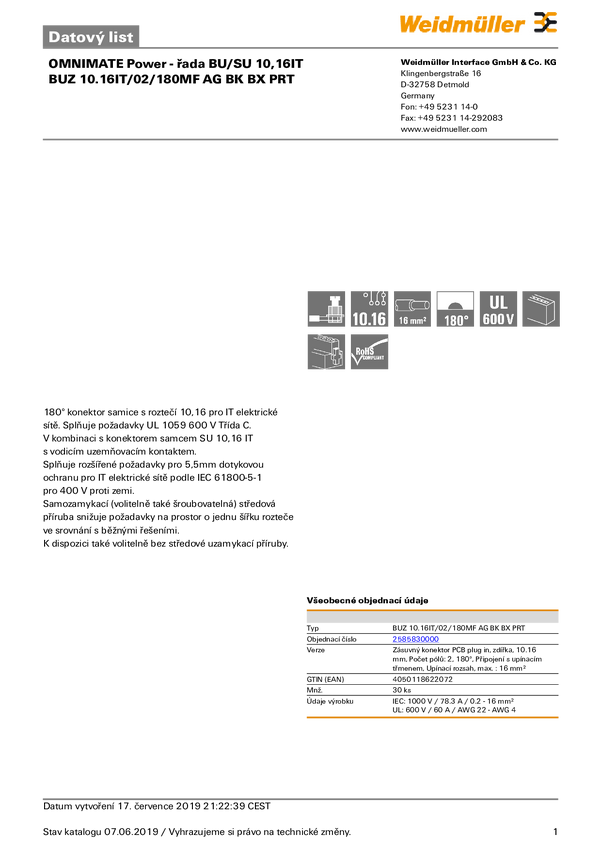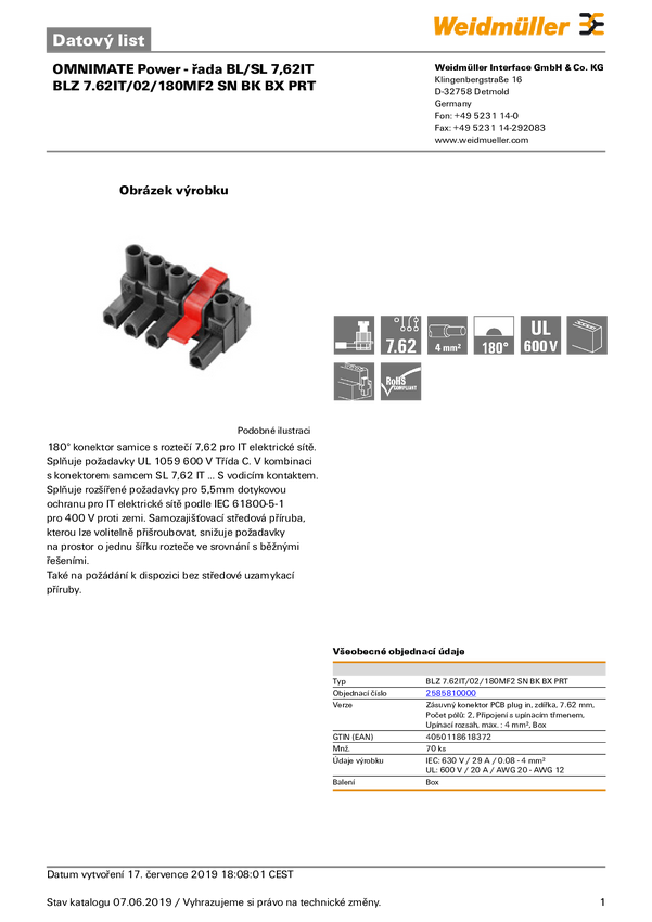 Weidmüller 2585810000 Obudowa złącza pin żeńskiego na kabel BLZ 7.62IT/02/180MF2 SN BK BX PRT, 70 szt.