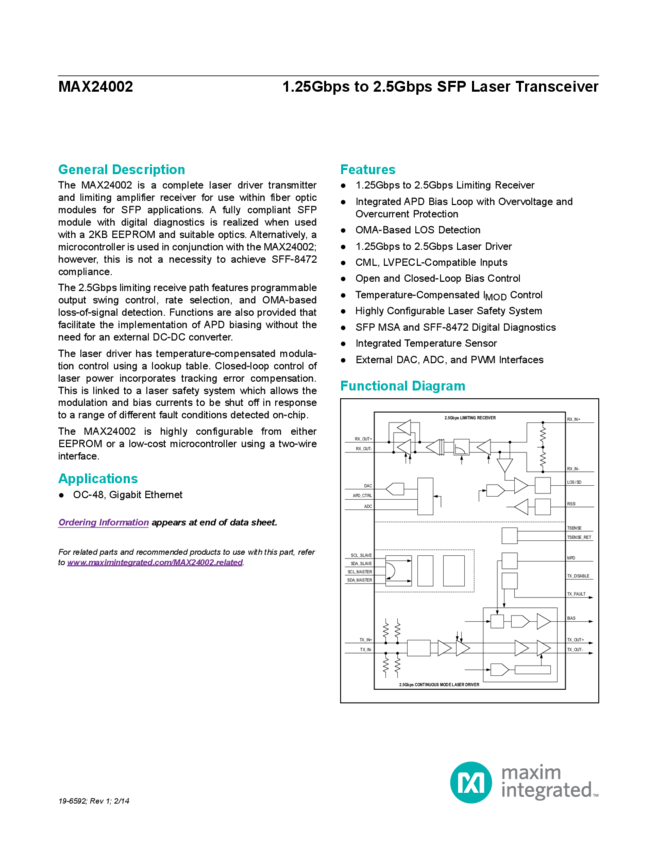 MAX24002 1.25Gbps to 2.5Gbps SFP Laser Transceiver