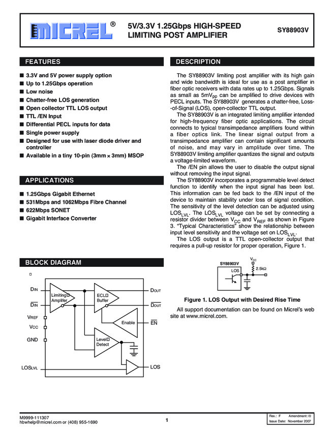 SY88903V- 5V/3.3V 1.25Gbps HIGH-SPEED LIMITING POST AMPLIFIER