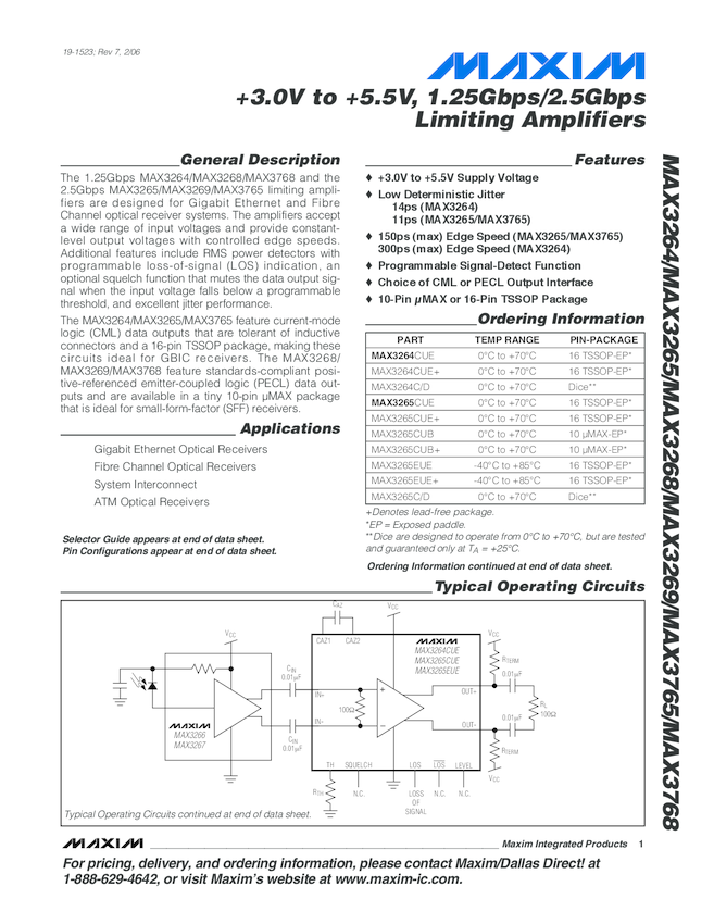 MAX3768 +3.0V to +5.5V, 1.25Gbps Limiting Amplifier