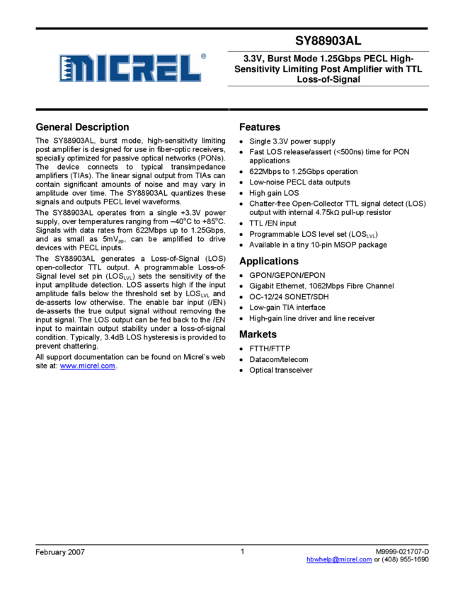 SY88903AL- 3.3V, Burst Mode 1.25Gbps PECL High-Sensitivity Limiting Post Amp