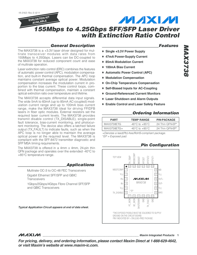 MAX3738 155Mbps to 4.25Gbps SFF/SFP Laser Driver with Extinction Ratio Control