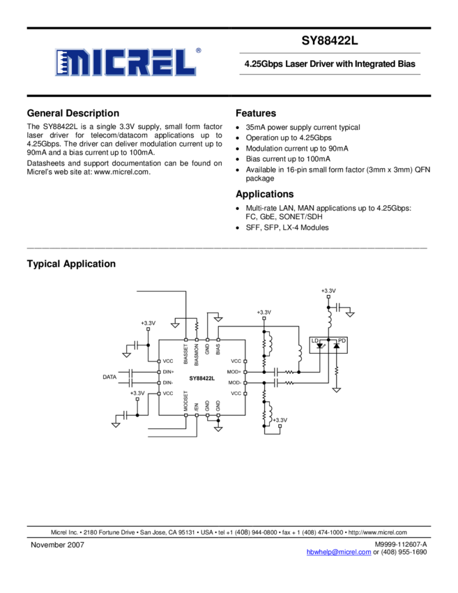 SY88422L-4.25Gbps Laser Driver with Integrated Bias