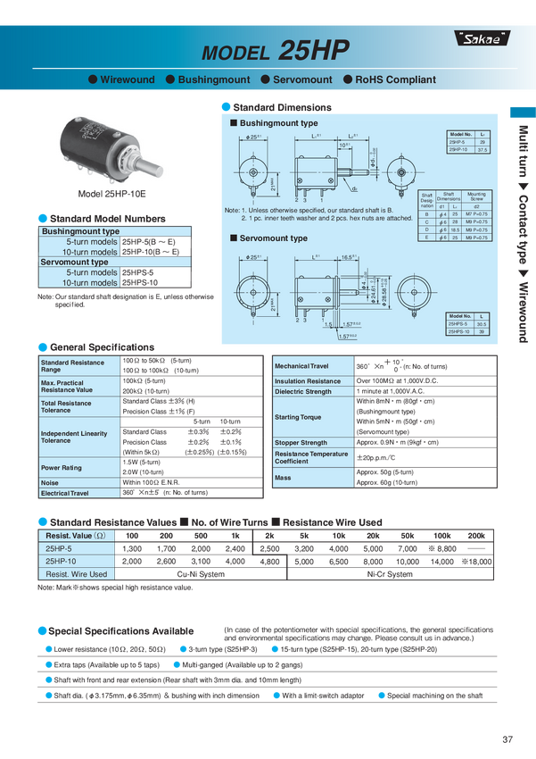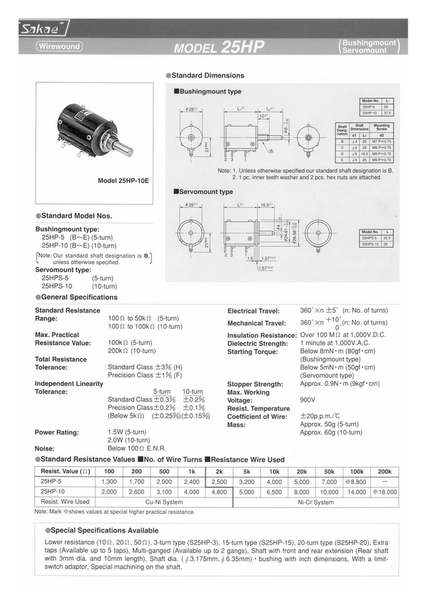 Potencjometr 20-to obrotowy drutowy na bazie modelu 25HP; Tol.Rez. 3%; liniowość 0,05%; moc. 2W; Bushing Inch-3/8UNef ośka 6,35mm dł.ośki 25mm; średnica 25mm dł.54,8mm; trwałość 2.000.000 cykli; IP40; Rezystancja 1 kohm;