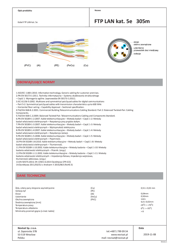 Przewód; do transmisji danych; UTP; 8x0,25mm2; drut; Cu; 4x2 żyły 0,50mm; czarny; PE +żel; zewnętrzny; okrągły; skrętka kat.5e; 50V; 6mm; szpula 305m; RoHS