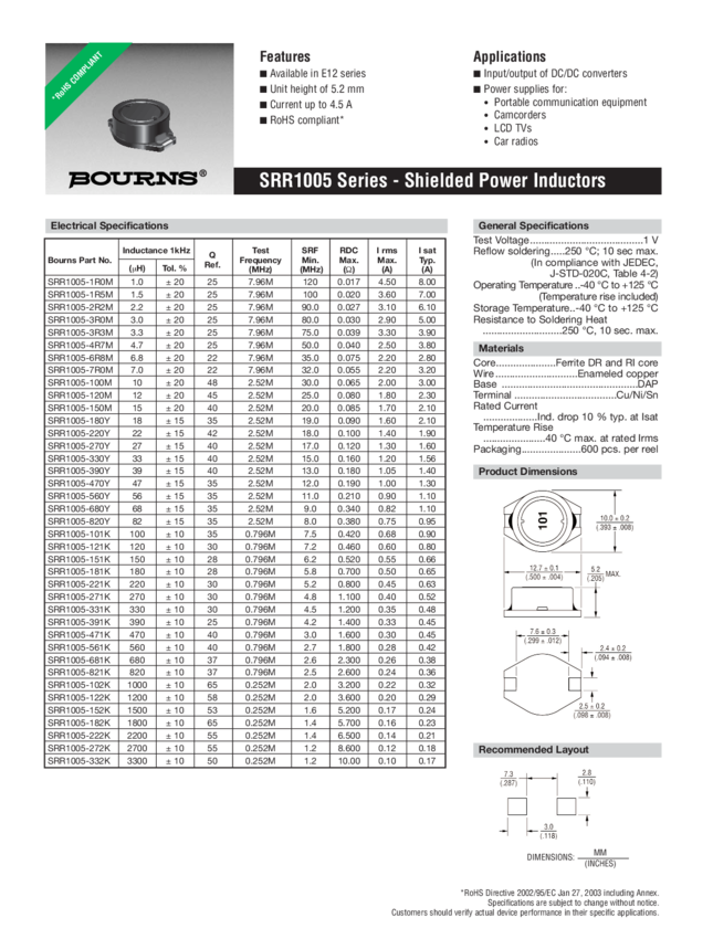 Ind Chip Wirewound 1uH 5% 25MHz 25Q-Factor Ferrite 330mA 1008 T/R