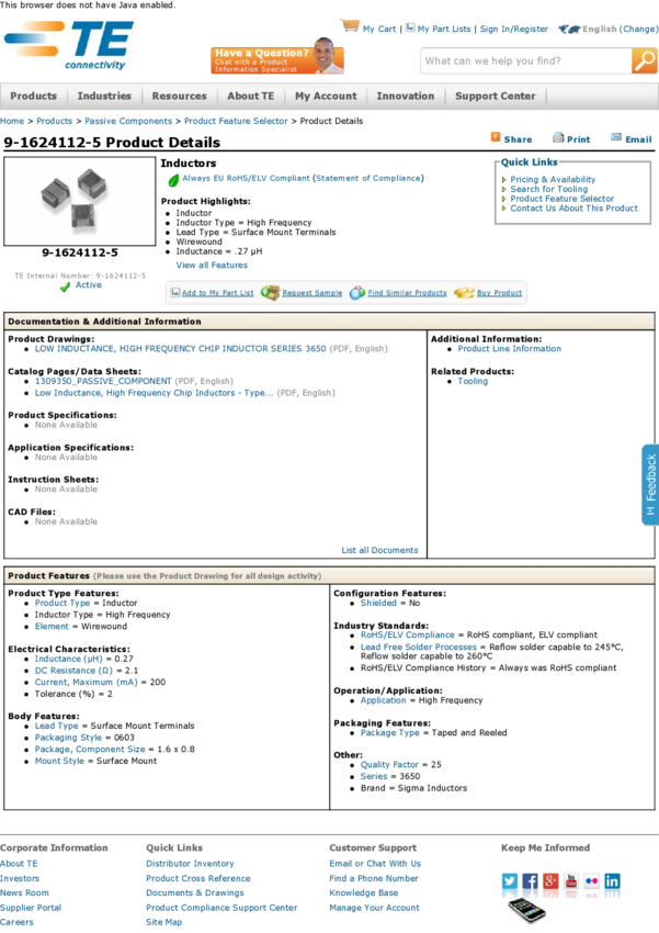 Ind High Frequency Chip Unshielded Wirewound 270nH 2% 25Q-Factor 200mA 0603 T/R