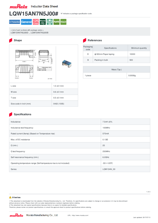 Ind RF Chip Wirewound 7.5nH 5% 100MHz 25Q-Factor 570mA 0402 Paper T/R