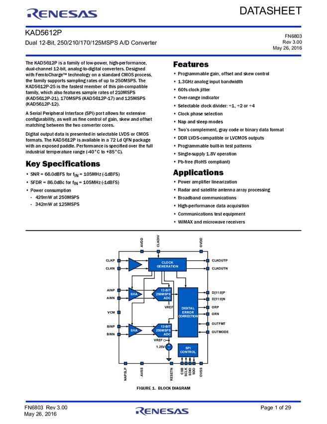 12-Bit, 250MSPS Dual-Channel ADC with LVDS/LVCMOS Outputs