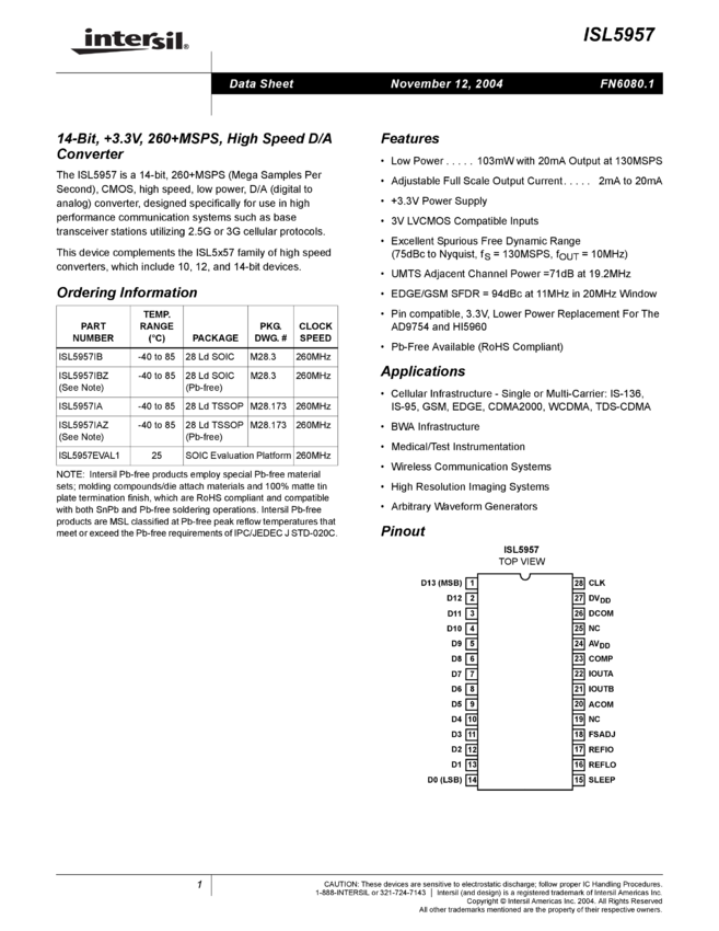 14-Bit, +3.3V, 260MSPS, High Speed D/A Converter