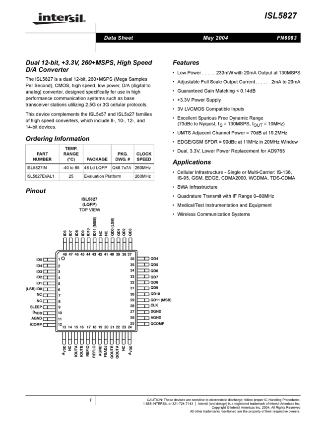 12-bit, +3.3V, 260MSPS, High Speed D/A Converter