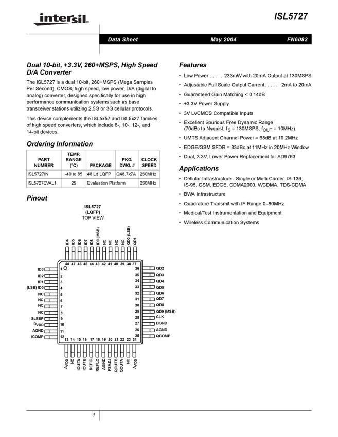 10-bit, +3.3V, 260MSPS, High Speed D/AConverter