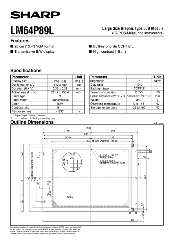 Wyświetlacz graficzny 10,4"=26cm; VGA 640 x 480; active area 211,2x158,4mm ; wym zew. 250(268)x190x 7 mm; nieprodukowany 2,55W; PODŚWIETLENIE 1 ccft(e); Transmissive B/W display gwarancja 14 dni ostatnia sztuka (stara )
