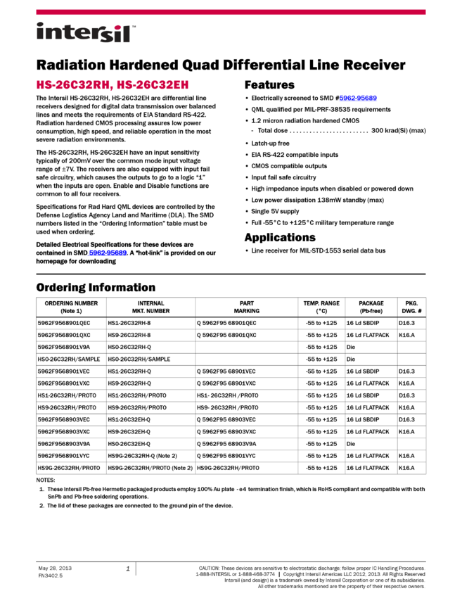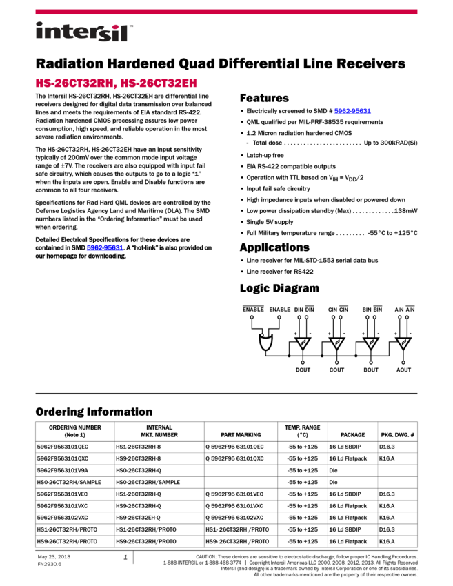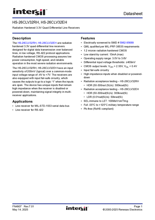 Radiation Hardened 3.3V Quad Differential Line Receiver