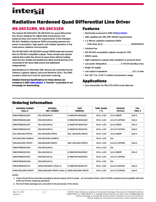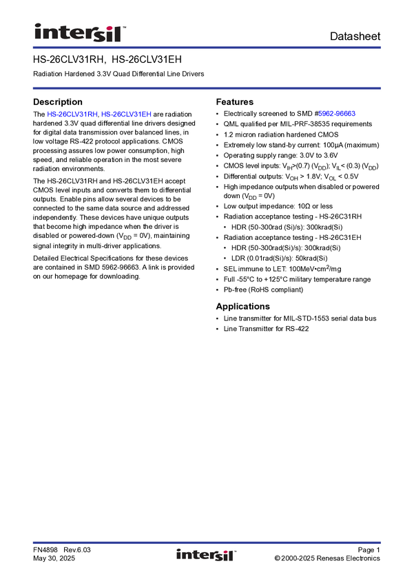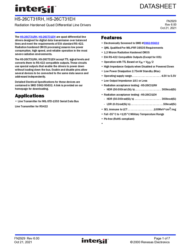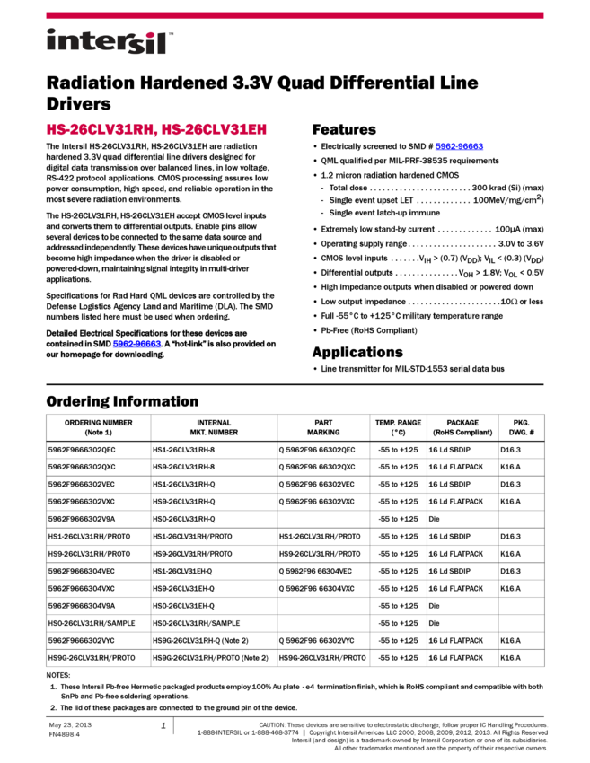 Radiation Hardened 3.3V Quad Differential Line Drivers