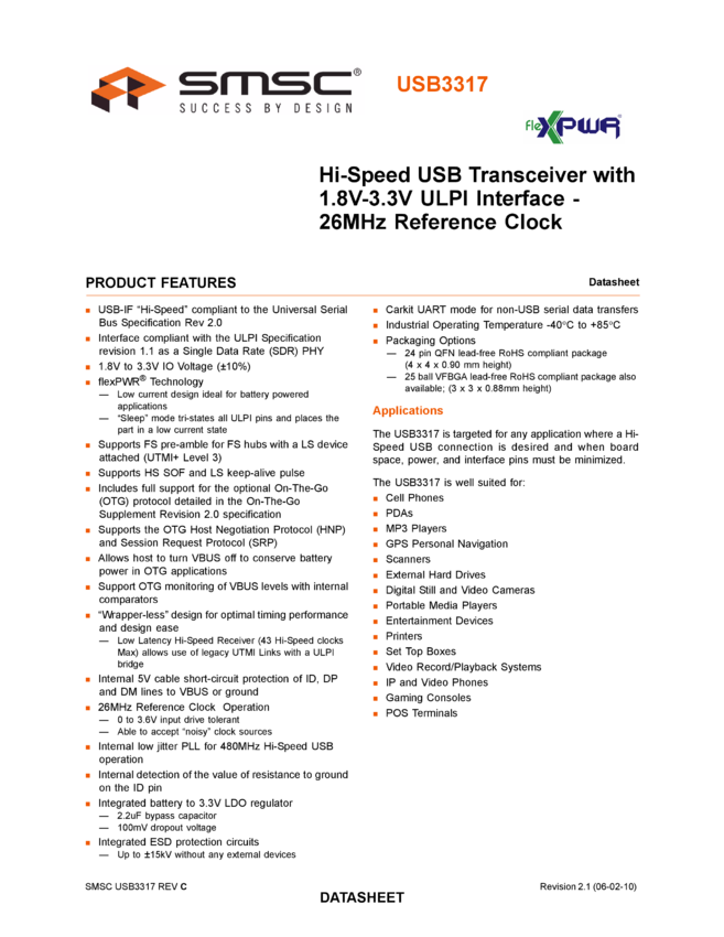 USB3317 Hi-Speed USB Transceiver with 1.8V-3.3V ULPI Interface - 26MHz Referenc (06/02/2010)