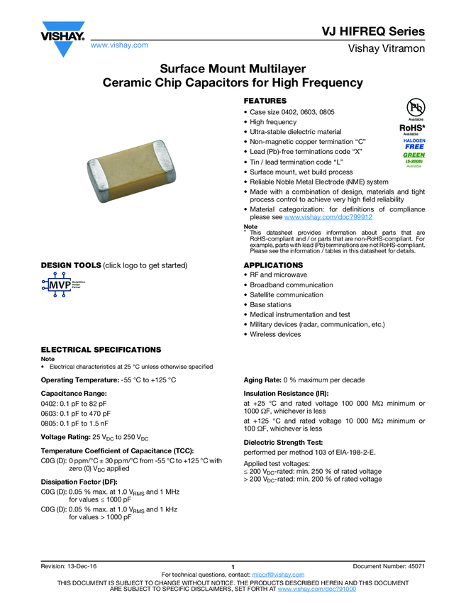 Cap Ceramic 270pF 250V C0G 10% SMD 0805 125°C T/R