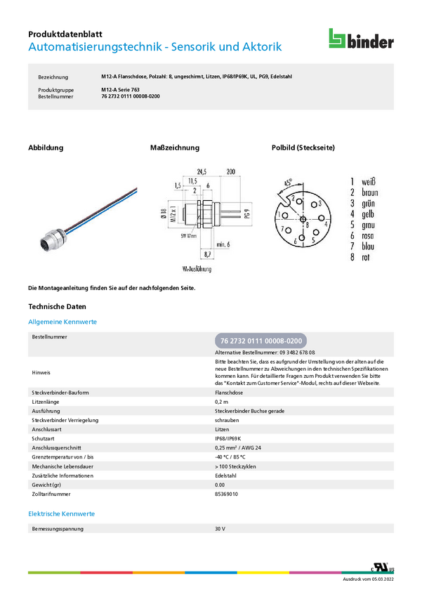 binder 76 2732 0111 00008-0200-20 Złącze niekonfekcjonowane czujnika/aktuatora złącze żeńskie proste Ilość pinów: 8 1 sz