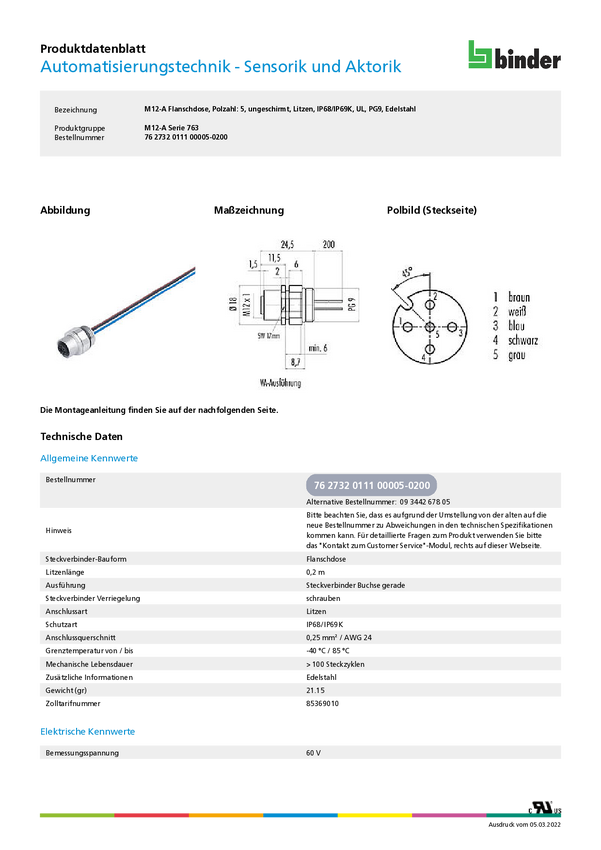 binder 76 2732 0111 00005-0200-20 Złącze niekonfekcjonowane czujnika/aktuatora złącze żeńskie proste Ilość pinów: 5 1 sz