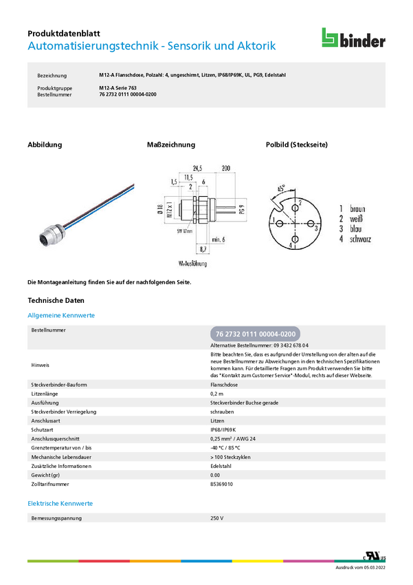 binder 76 2732 0111 00004-0200-20 Złącze niekonfekcjonowane czujnika/aktuatora złącze żeńskie proste Ilość pinów: 4 1 sz