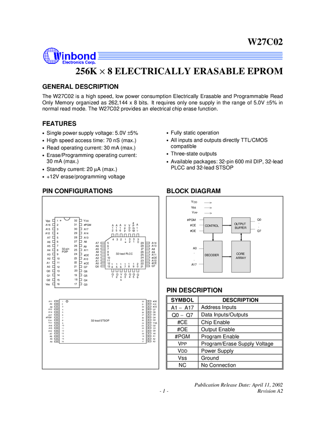 Pamięć EPROM kasowalna elektrycznie W27C02 DIL32 70ns (zam. 27C020/2001), –55°C do +125°C