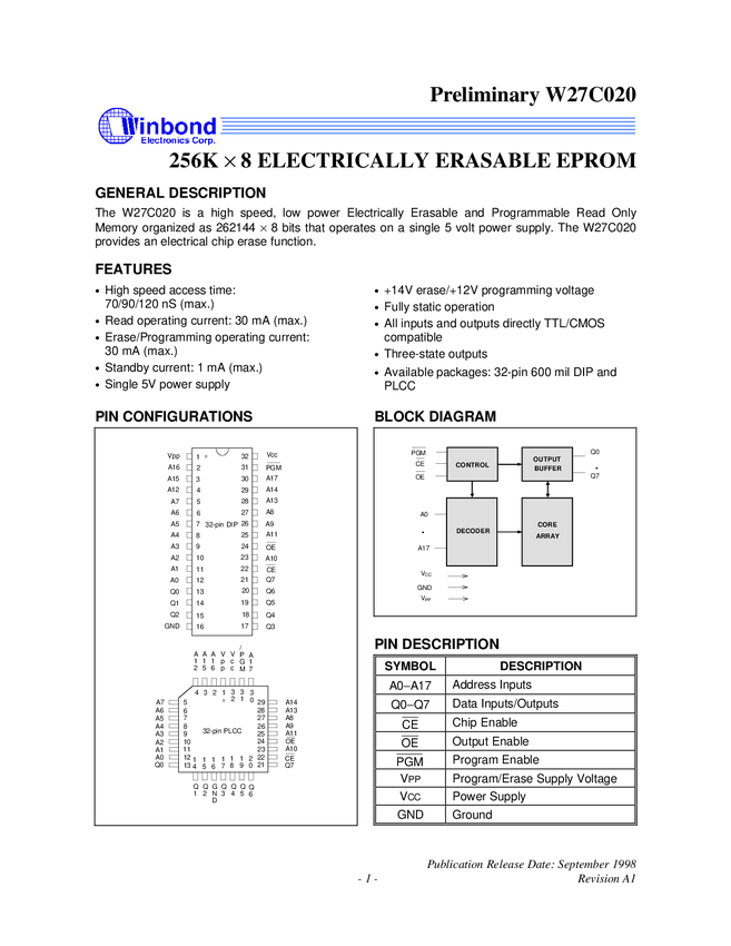 Pamięć EPROM kasowalna elektrycznie W27C020 DIL32 70ns (zam. 27C020/2001), –55°C do +125°C