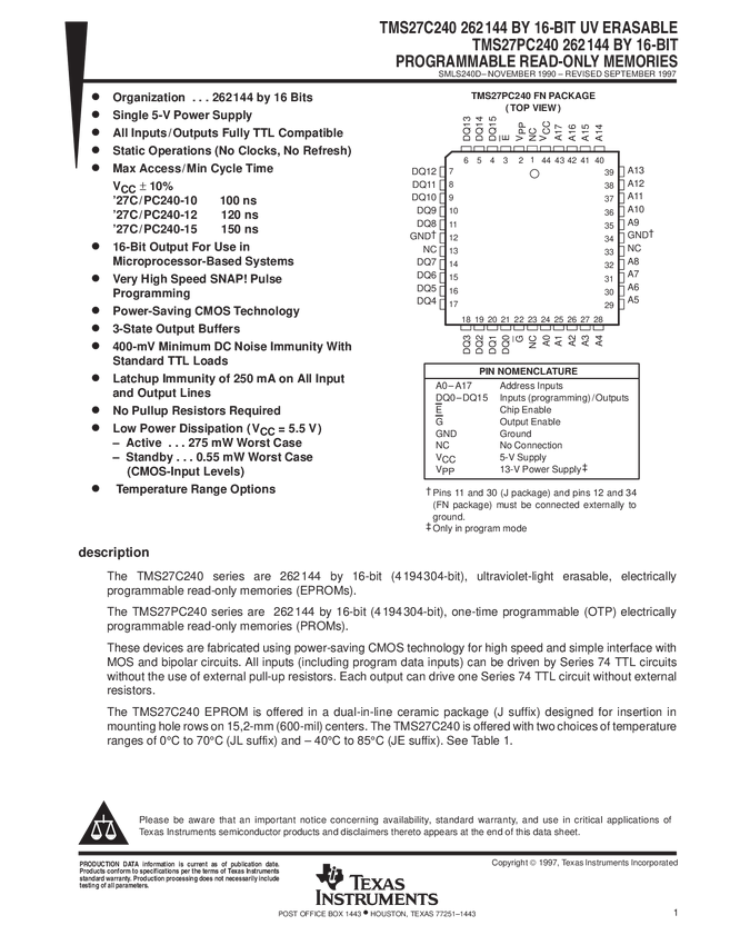 Pamięć EPROM B58533 / 27C240 PLCC44 (OTP) TI/Bosch (zam. 27C4096/4002), 120ns, –55°C do +85°C
