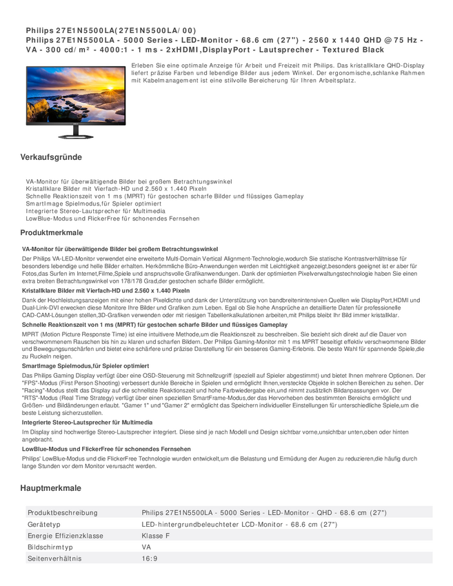Philips Monitore 27E1N5500LA/00 Monitor EEK F (A - G) 68.6 cm (27 cal) 2560 x 1440 px 16:9 4 ms HDMI, DisplayPort, Audio