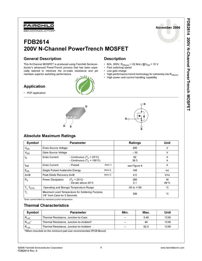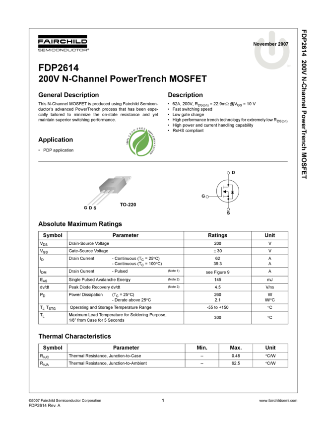 N-Channel PowerTrench® MOSFET 200V, 62A, 27mΩ