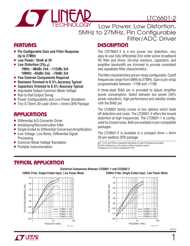 Low Power, Low Distortion, Low Power, Low Distortion, 5MHz to 27MHz, Pin Configurable Filter/ADC Driver